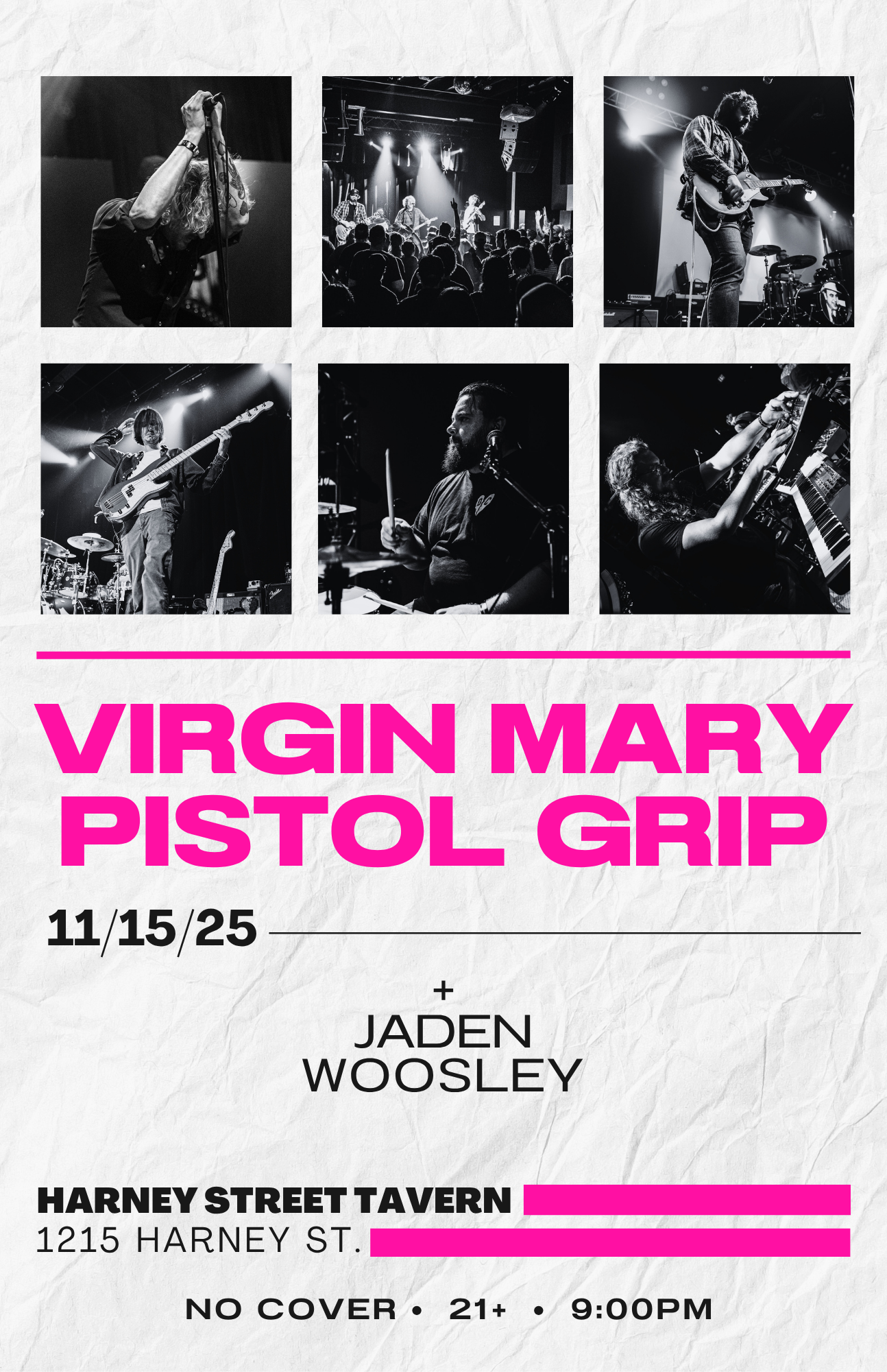 Harney Street Tavern Virgin Mary Pistol Grip November 15, 2025 Omaha, NE Harney Street Tavern Google Map FACEBOOK EVENT FREE | 9:00pm | 21+ Virgin Mary Pistol Grip returns to HST!Jaden Woosley opens the show.