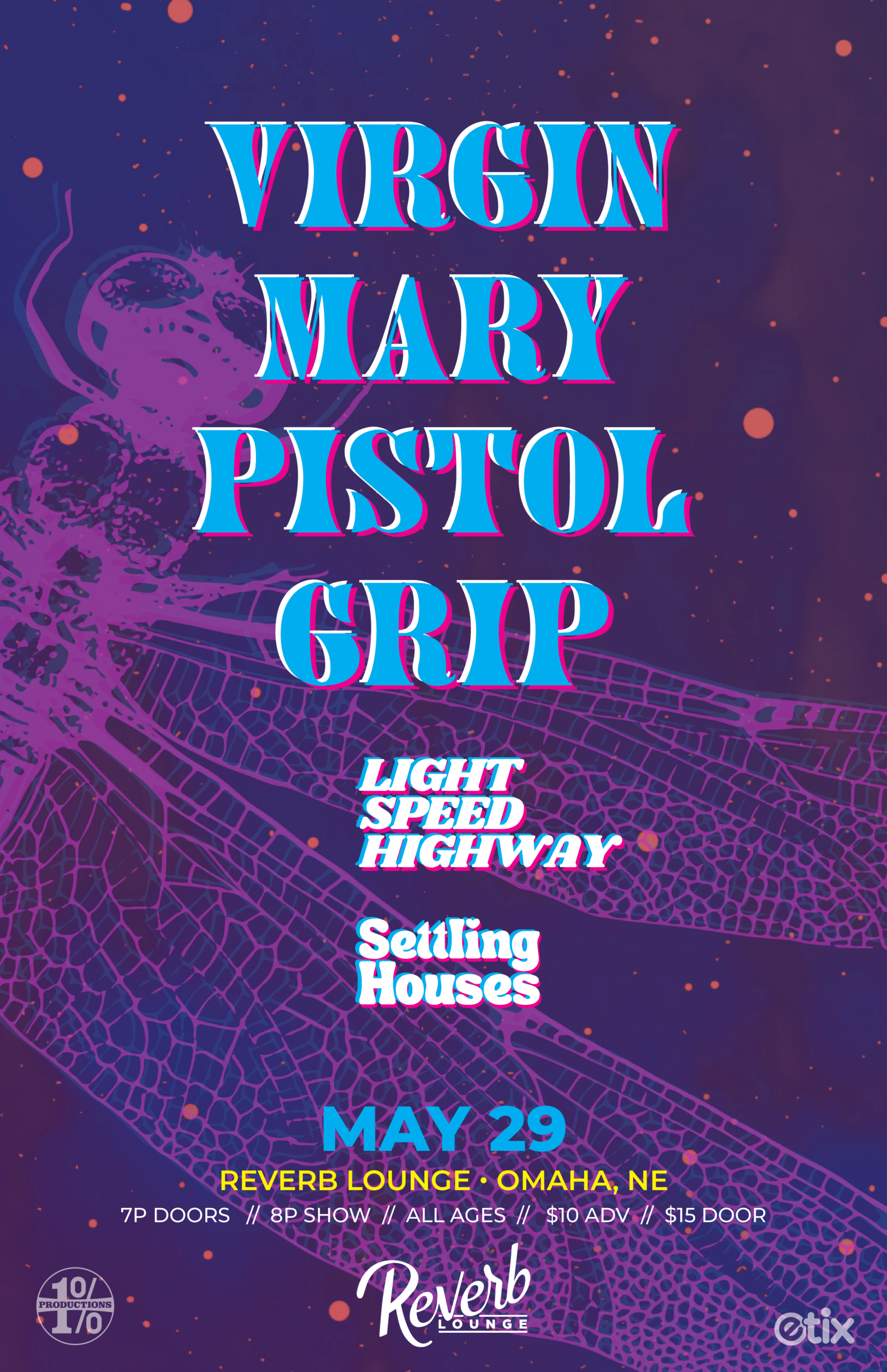 Reverb Lounge Virgin Mary Pistol Grip May 29, 2026 Omaha, NE Reverb Lounge Google Map TICKETS Doors 7pm | Show 8pmAll Ages$10 Adv. | $15 Day of Show with Light Speed Highway and Settling Houses. Presented by 1% Productions.